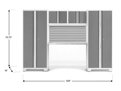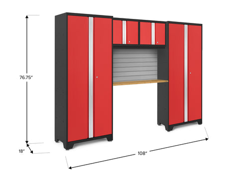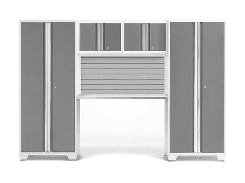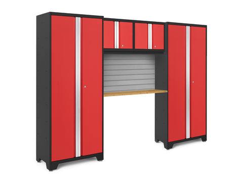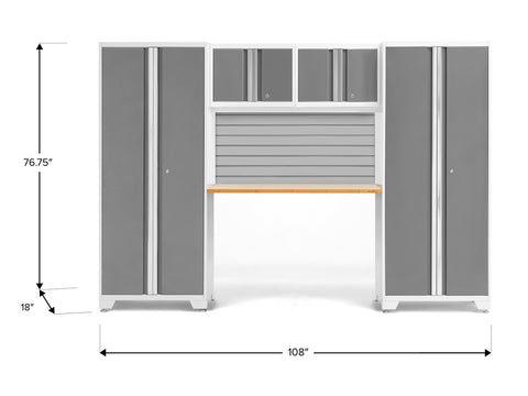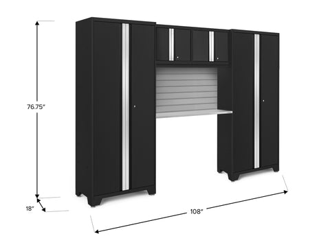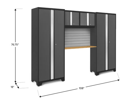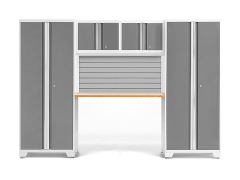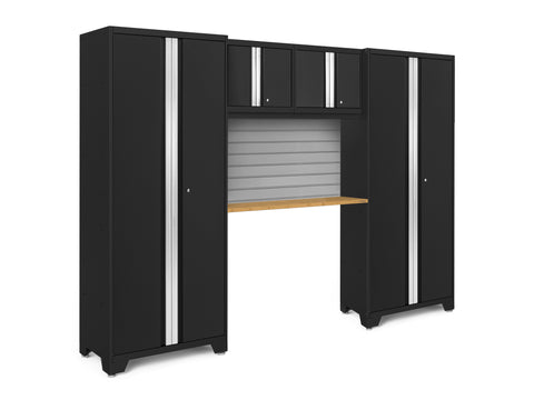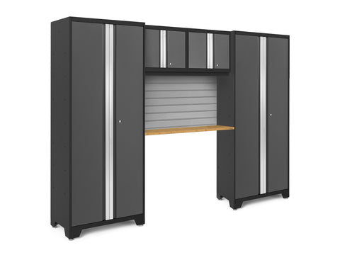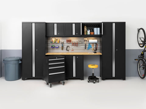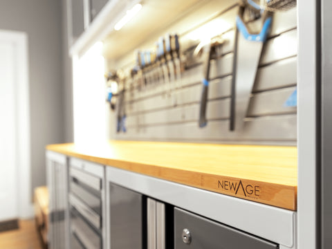 Transform your garage with the NewAge Bold Series 5-Piece Cabinet Set, a compact storage solution designed to meet all your basic garage needs. Built with heavy duty welded steel frames and 24-gauge steel, this cabinet set provides outstanding strength and longevity. The RTA Locker ships flat-packed with steel frame panels for easy assembly. It supports up to 800 lb and includes three height-adjustable steel shelves plus a removable closet rod for hanging storage. The wall cabinet provides an off-the-floor storage solution with a weight capacity of up to 100 lbs., perfect for keeping small items neatly stored. Slatwall Backsplash holds up to 150 lbs./sq. ft. Features impact-resistant panels, hidden fasteners, and interlocking design for easy installation. The 48-in. bamboo or stainless-steel worktop offers a versatile space for DIY projects, kids' crafts, and more. This compact garage cabinet set is ideal for organizing everything from sports equipment to gardening tools, and its durable coating ensures long-term protection against everyday heavy use. Get organized and enhance the functionality of your garage with the Bold Series Cabinet System.