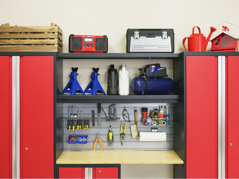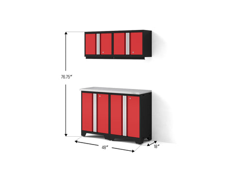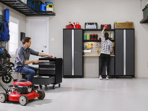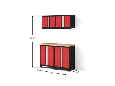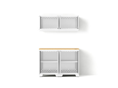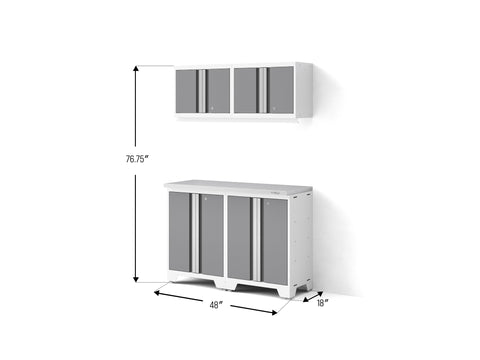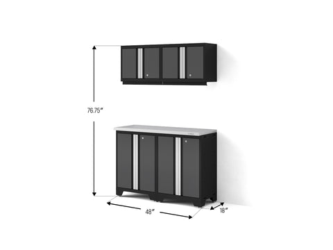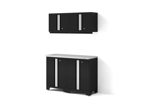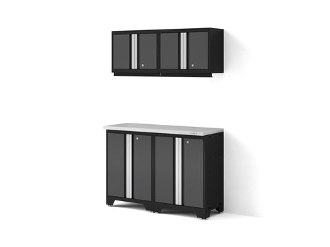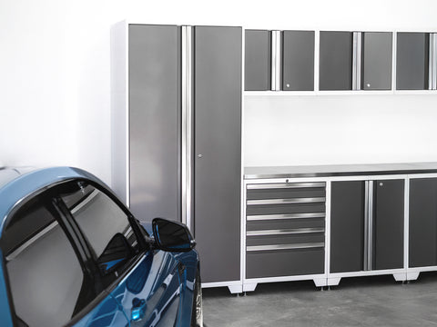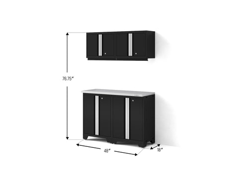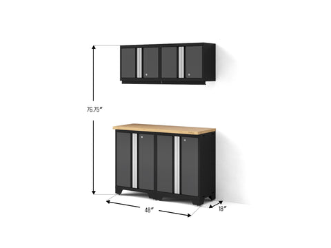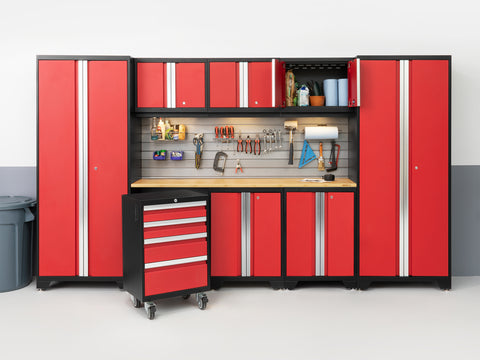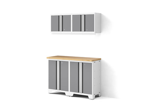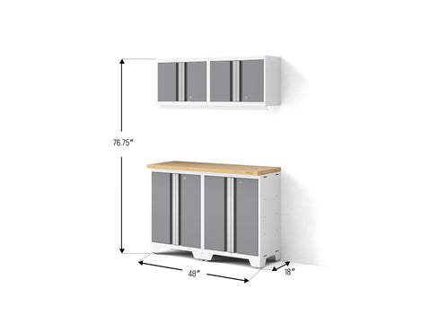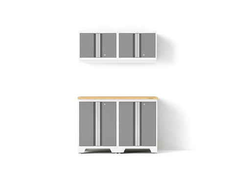 Transform your garage with the NewAge Bold Series 5-Piece Cabinet Set, a compact storage solution designed to meet all your basic garage needs. Built with heavy duty welded steel frames and 24-gauge steel, this cabinet set provides outstanding strength and longevity. The base cabinet has a weight capacity of up to 600 lbs. and includes one height-adjustable steel shelf with a cable management access hole to keep your power tools charged. The wall cabinet provides an off-the-floor storage solution with a weight capacity of up to 100 lbs., perfect for keeping small items neatly stored. Full-length aluminum handles allow easy access to your items, while lockable doors ensure everything stays safe and secure. The 48-inch bamboo or stainless-steel worktop offers a versatile space for DIY projects, kids' crafts, and more. This compact garage cabinet set is ideal for organizing everything from sports equipment to gardening tools, and its durable coating ensures long-term protection against everyday heavy use. Get organized and enhance the functionality of your garage with the Bold Series Cabinet System.