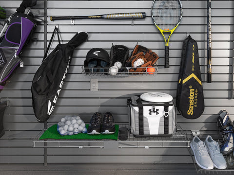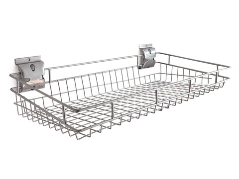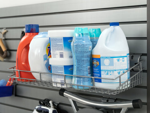 Maximize your slatwall system with NewAge Products Slatwall Accessories. Designed for use with NewAge Products Steel and PVC Slatwall systems, and compatible with most 3 in. on-center slatwall systems, our snap-in Slatwall Accessories are built with steel for extra strength. The powder-coat silver gloss finish looks great in any space and on both silver and black slatwall solutions. With a lip to prevent your items from falling off, the Shallow Basket is ideal for storing cleaning supplies, paint cans, and gardening pots.
