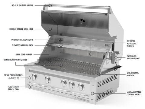 BTU output, burner dimensions and selected features vary by grill size.